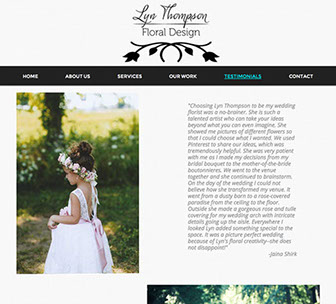 Lyn Thompson is a small business owner and florist. Lyn has been in the business for over 30 years, specializing in custom designs for weddings or special events. She has grown her business primarily from referrals. Lyn hired me to help create her new brand and online presence. I started by doing an audit of existing collateral, and working with her to define her audience and brand personality. I then created a simple and elegant website to allow her to expand her client base.