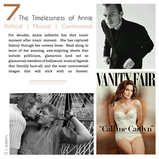 Choosing Annie Leibowitz as the modern artist was an easy decision- her images are all strong, bold, and they each make a statement. I simply had to find a way to put them all together where the images and the text worked together and didn’t compete with each other.